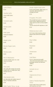 Heading to East Peoria, Reverence Coffee has some unique menu items that are a must-try. The Pumpkin Pie Latte at this café stands out from other pumpkin-flavored drinks because it can be made with either espresso or chai. It also contains real pumpkin puree. For those who enjoy apple flavors, they offer another option: the Ginger Apple Snap Latte. You can add caramel to this drink for a more fall flavor. For their food menu, they have a limited menu of baked goods, which includes their tasty crookies (cookie-filled croissant). On a budget, and need something sweet? For just a dollar, you can buy a honey stick and support a local small business.